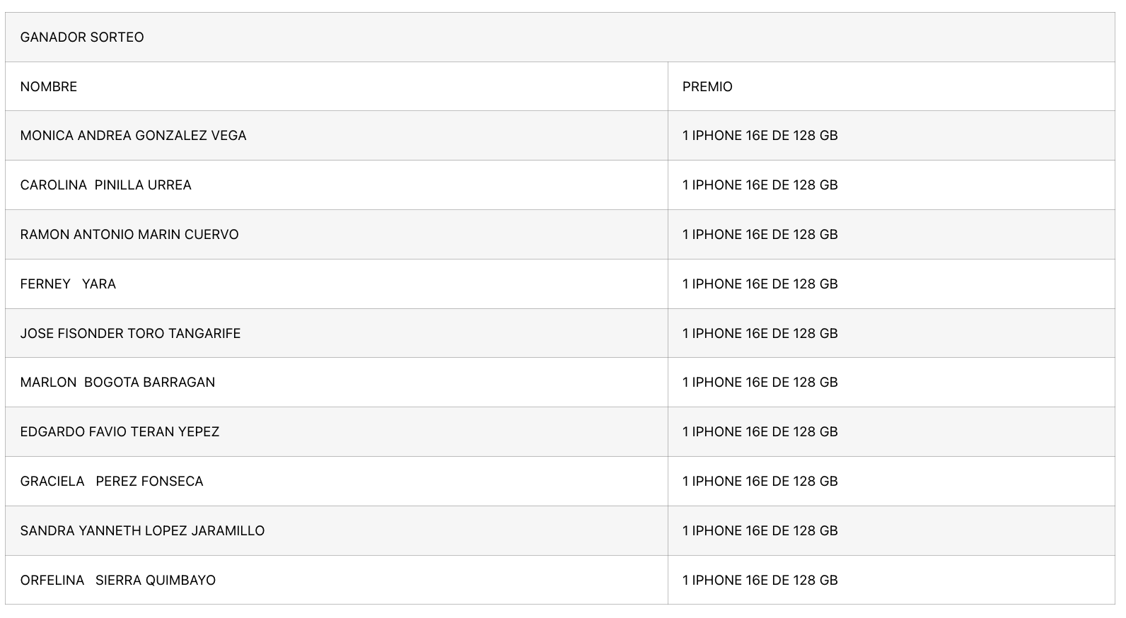 2. De la base de usuarios que cumplan con la mecánica descrita anteriormente, es decir que se hayan registrado en la landing de Amigos Paga Todo (amigospagatodo.com.co) durante la vigencia de la actividad, se sustraerán de manera aleatoria y consecutiva, mediante tómbola virtual, diez (10) registros, cada uno como ganador de un (1) CELULAR IPHONE 16E DE 128 GB. Seguidamente, se sustraerán de manera aleatoria y consecutiva cuarenta (40) registros adicionales que en su orden serán suplentes de los primeros ganadores, en la medida que estos clientes no puedan acceder al premio y/o no cumplan con las condiciones exigidas para tal fin.