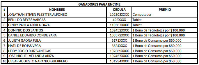 Por políticas internas de participación, los siguientes usuarios no podrán participar en esta actividad por los premios mayores (Computador portátil y Tablet): (CONSULTA AQUÍ)