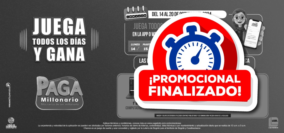 JUEGA TODOS LOS DÍAS Y GANA – PAGA MILLONARIO, la cual hace parte de las estrategias de marketing diseñadas para motivar e impulsar la compra de los productos, juegos de suerte y azar y/o servicios que integran su portafolio, dándole a sus clientes la posibilidad de participar en la actividad a realizarse para la APP o Sucursal Virtual, y que lo podrán hacer acreedor de uno de los premios que se entregarán de acuerdo con la mecánica y condiciones previstas para dicha actividad.