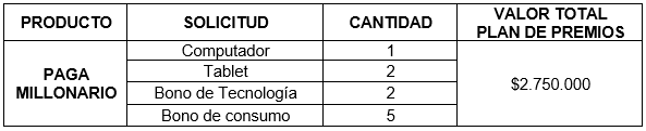 - Las primeras 10 personas que jueguen en el menor tiempo el producto PAGA MILLONARIO desde $4.000 IVA Incluido todos los días desde el 14 de octubre al 20 de octubre de 2024, ganan automáticamente
