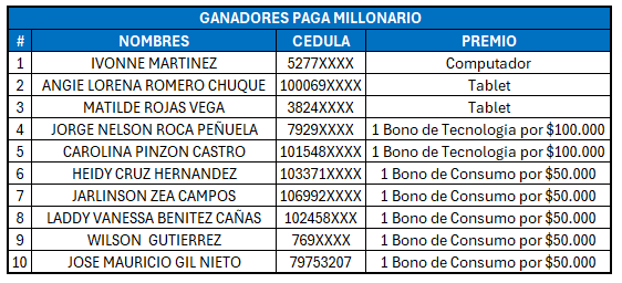 - Los usuarios ganadores del Computador portátil y tablets del promocional realizado del veintidós (22) de julio al veintiocho (28) de julio del 2024 (CONSULTA AQUÍ)