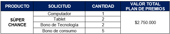 - Las primeras 10 personas que realicen la mayor cantidad de transacciones del producto SÚPER CHANCE desde $3.000 IVA Incluido todos los días desde el 9 de diciembre al 15 de diciembre de 2024, ganan automáticamente
