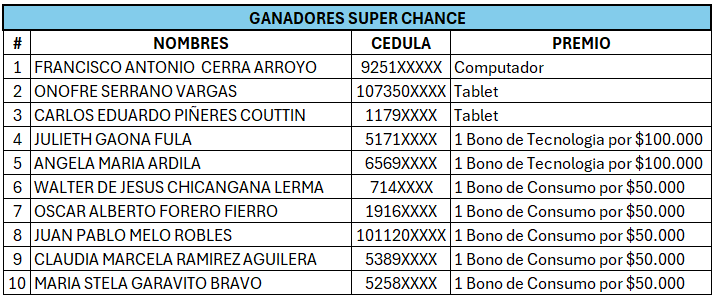- La selección de los ganadores se realizará por las personas que realicen mínimo una transacción cada día y adicional por la sumatoria total de transacciones realizadas durante la vigencia del 9 de diciembre al 15 de diciembre del 2024 en el producto Súper Chance, los ganadores serán las primeras 10 personas en cumplir con la mecánica.